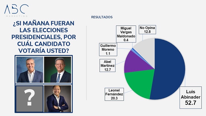A los entrevistados se les preguntó ¿si mañana fueran las elecciones presidenciales por cuál candidato votaría?. Un 52.7% dijo que por  Abinader, 20.3% por Leonel Fernández, 12.7% por Abel Martínez, 1.1% por Guillermo Moreno,  0.4% por Miguel Vargas y el 12.8% no opinó.