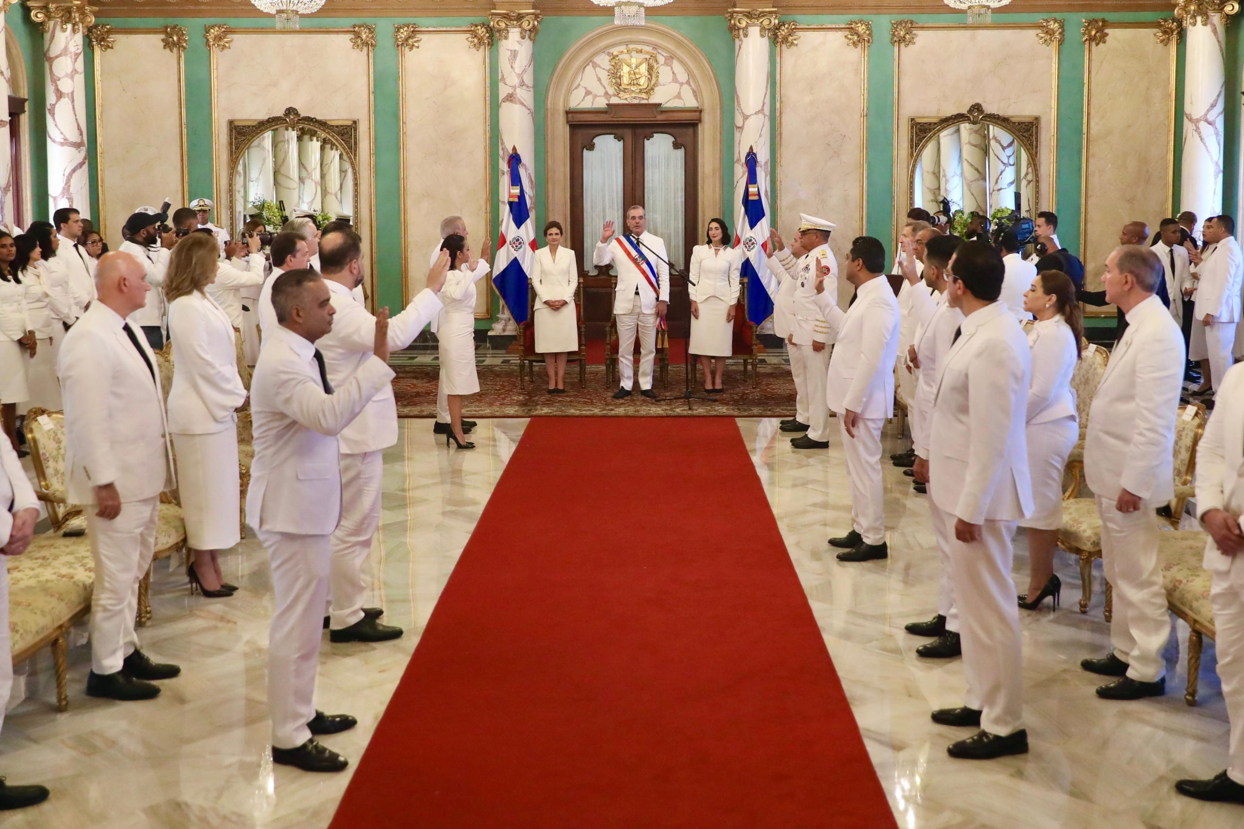 El Jefe de Estado, acompañado de la primera dama Raquel Arbaje y de la vicepresidenta Raquel Peña, tomó el juramento de los funcionarios, en un acto realizado en el Salón de Embajadores del Palacio Nacional, luego de ser investido con la banda presidencial en el Teatro Nacional Eduardo Brito que fungió como Asamblea Nacional.