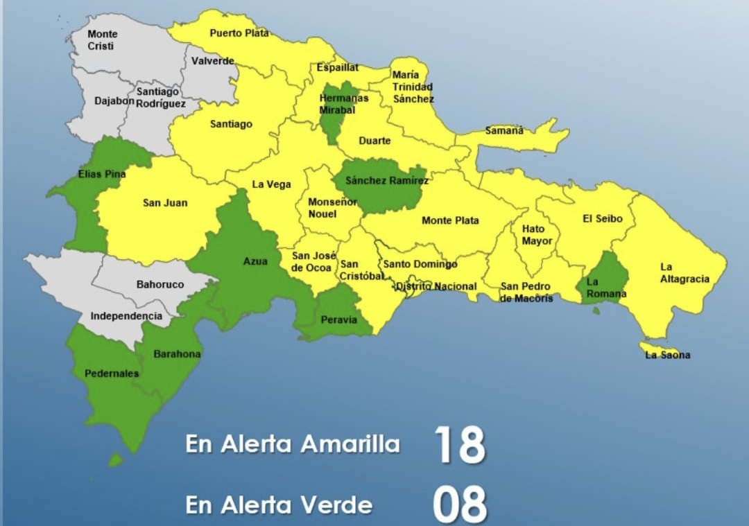 Las provincias en alerta verde son Sánchez Ramírez, La Romana, Elías Piña, Barahona, Peravia, Azua, Hermanas Mirabal y Pedernales.