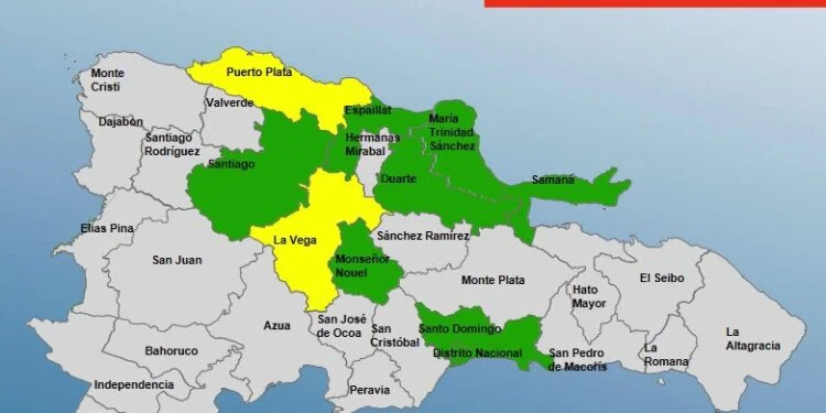 En alerta amarilla se encuentra, Puerto Plata y La Vega, mientras que en alerta verde están; Santiago, María Trinidad Sánchez, Espaillat, Samaná, Santo Domingo, Monseñor Nouel Duarte, en especial el Bajo Yuna.