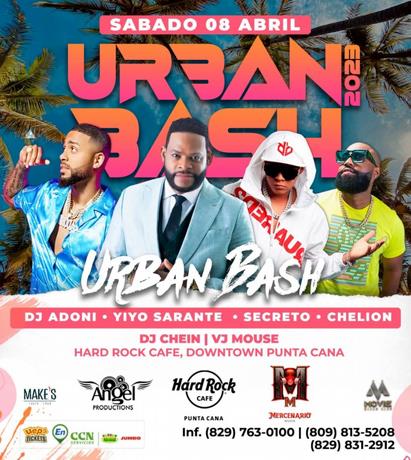 La edición 2023 del concierto “Urban Bash” reunirá el sábado 8 al popular mezclador Dj Adoni, el salsero Yiyo Sarante, el exponente urbano Secreto y el bachatero Chelion; en Hard Rock Café de Punta Cana, ubicado en el centro comercial Down Town.
