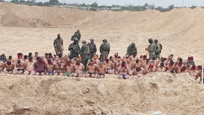 Las imágenes difundidas en redes sociales muestran a decenas de presuntos combatientes sentados en el piso, en filas y semidesnudos, muchos con las manos en la cabeza y mirando al piso.