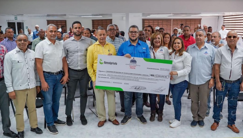 El funcionario entregó simbólicamente un cheque por 13 millones para la construcción de viveros, que son una primera partida de un Plan de Inversión que el FEDA desea ejecutar, equivalente a RD$250 millones, los cuales serán usados para recuperación de centros de acopio en todas las zonas cacaocultoras y en el Centro de Fermentación..