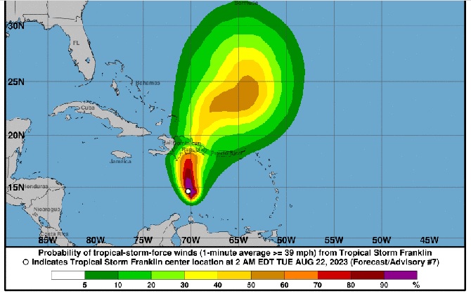 SANTO DOMINGO.- El centro de la tormenta tropical Franklin está a casi 400 kilómetros al sur de Santo Domingo, con vientos máximos sostenidos de 85 kilómetros por hora, moviéndose hacia el norte a 6 kilómetros por hora.