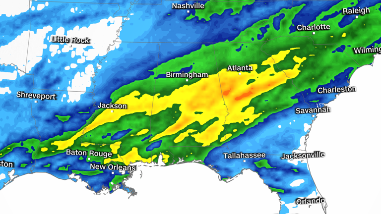 Existe un riesgo de nivel 3 de 4 de inundaciones por lluvias en partes de Alabama y Georgia, incluidas partes del área metropolitana de Atlanta. Atlanta ya sufrió importantes inundaciones el miércoles después de que 3 pulgadas de lluvia inundaran el área.