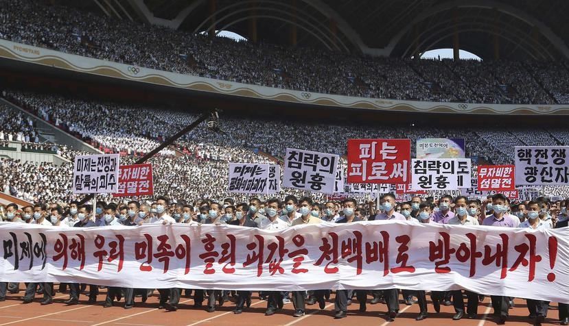 Imágenes publicadas por el diario Rodong Sinmun norcoreano mostraban un estadio abarrotado, probablemente con decenas de miles de personas, con mascarillas contra el COVID-19. La gente alzaba el puño y mostraba carteles con mensajes como “erradiquemos a los invasores imperialistas estadounidenses” y “todo el territorio continental de Estados Unidos está en nuestro rango de alcance”.