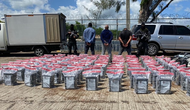 Al abordar la lancha arrestaron a tres hombres (dos colombianos y un dominicano) y se incautaron 20 pacas con los 590 paquetes de una sustancia que suponen es cocaína, un GPS, dos celulares, una pistola con su cargador, varios garrafones de combustibles, una lona, agua y otras evidencias.