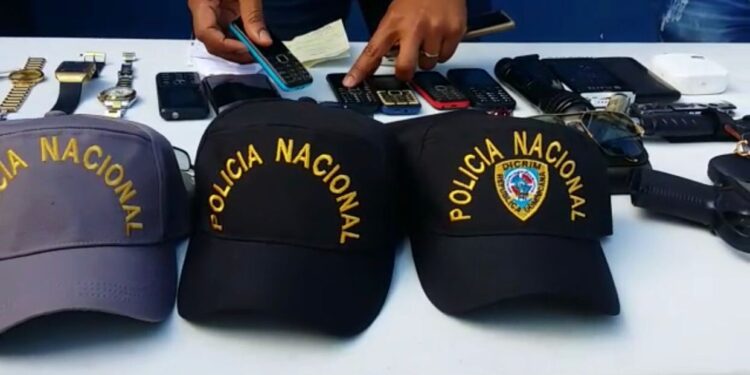 A los detenidos le fue ocupado un arma de fuego tipo pistola, marca Smith y Wesson, con su cargador y capsulas, tres gorras con insignias de Policía Nacional y DICRIM, dos cuchillos, varios teléfonos celulares, cadenas de oro y plata, reloj rolex y movado, lentes, entre otros objetos.