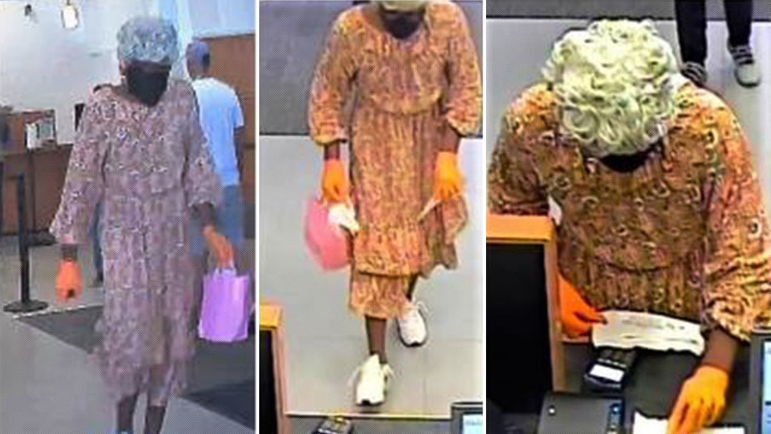 Las autoridades describen al hombre como un sujeto delgado y alto. Las imágenes capturadas por las cámaras de seguridad muestran que llevaba un vestido floral, zapatillas blancas, guantes de látex naranja, una peluca blanca y una máscara facial oscura durante el atraco.