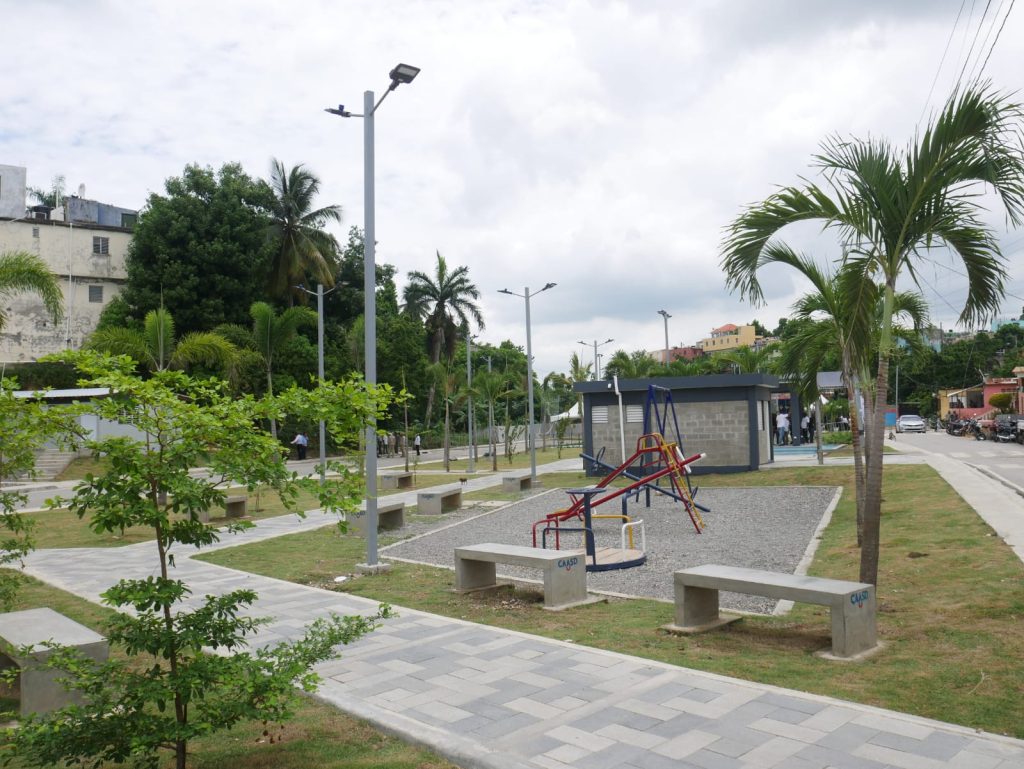 El parque fue construido encima de la cañada saneada, entregada a los comunitarios por el presidente Abinader en 2021, cuyos trabajos se realizaron en varias fases. Hoy, es una realidad el parque para deleite de las familias que residen en el municipio.